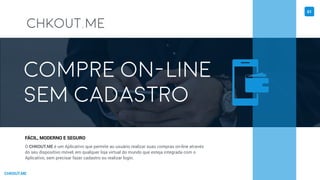 O documento descreve o aplicativo Chkout.me, que permite aos usuários finalizarem compras online em diferentes lojas virtuais de forma rápida e segura através de seus dispositivos móveis, sem necessidade de cadastro ou login. O aplicativo armazena com segurança os dados do usuário localmente para agilizar o processo de checkout e aumentar as taxas de conversão para lojistas.