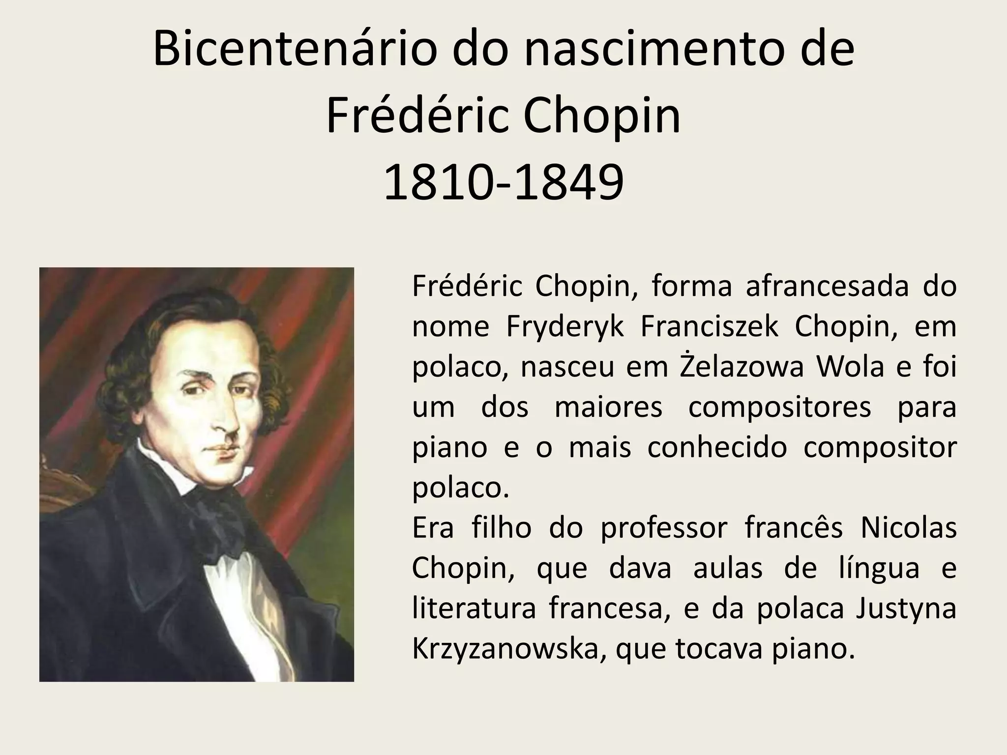 Frédéric Chopin foi um compositor polonês nascido em 1810 que se destacou com suas composições para piano. Ele deixou a Polônia em 1830 para viver em Paris, onde teve contato com outros compositores da época e viveu por nove anos com a escritora George Sand, falecendo em 1849 vítima da tuberculose. Sua obra reflete influências do folclore polonês e representa um grande desafio para jovens pianistas.