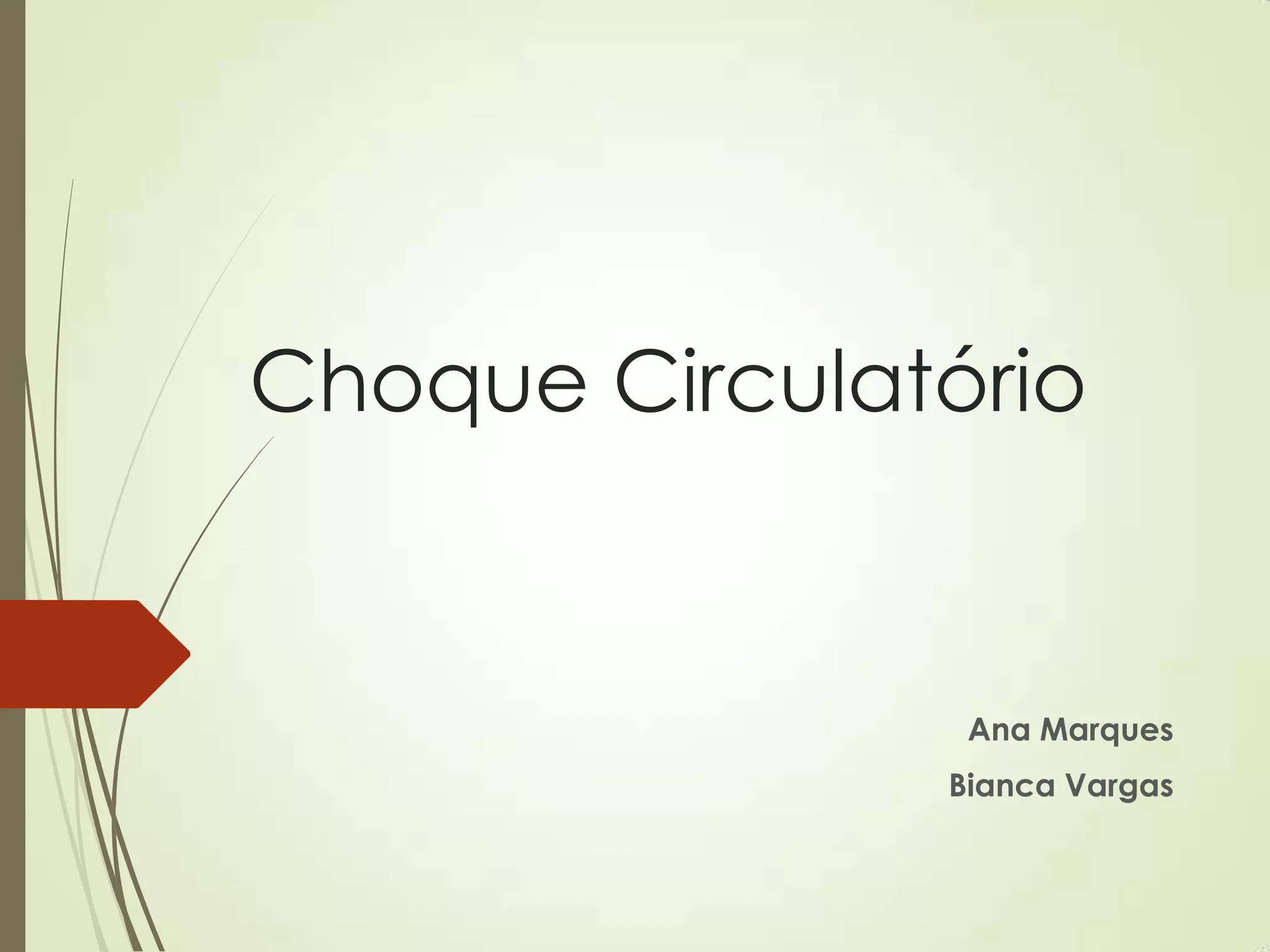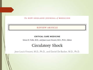 O documento discute choque circulatório, definindo-o como uma insuficiência circulatória que resulta em má utilização de oxigênio pelas células. Descreve os sinais clínicos, mecanismos fisiopatológicos, abordagem inicial, objetivos do suporte hemodinâmico e prioridades terapêuticas no tratamento de pacientes em choque.