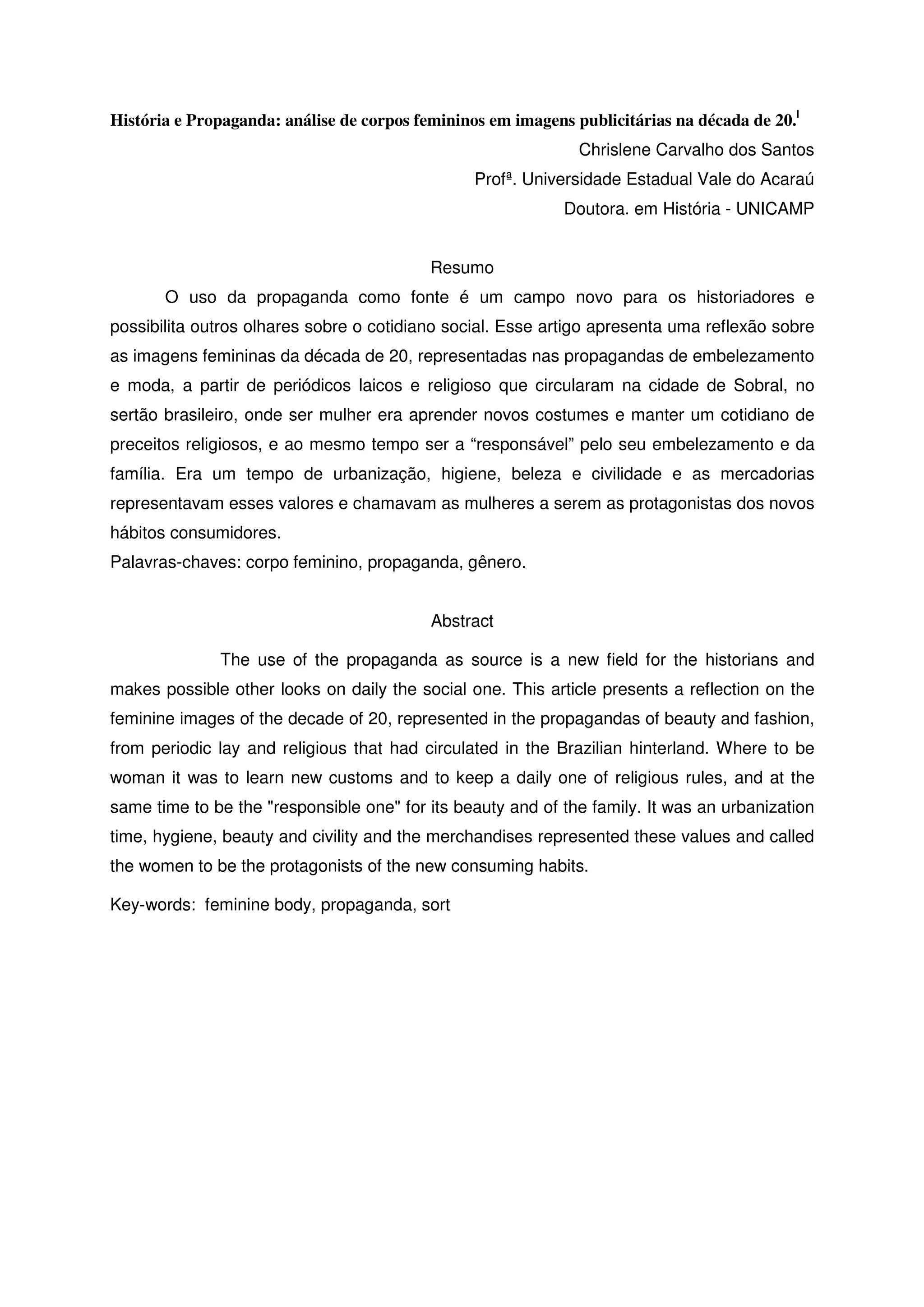 O documento analisa imagens de corpos femininos em propagandas de jornais da década de 1920 na cidade de Sobral, Ceará. As propagandas promoviam novos padrões de beleza e estilo de vida urbano, embora contraditoriamente também circulassem discursos religiosos conservadores. A análise revela tensões entre valores modernizantes e tradicionais no trato do corpo e papel da mulher na época.
