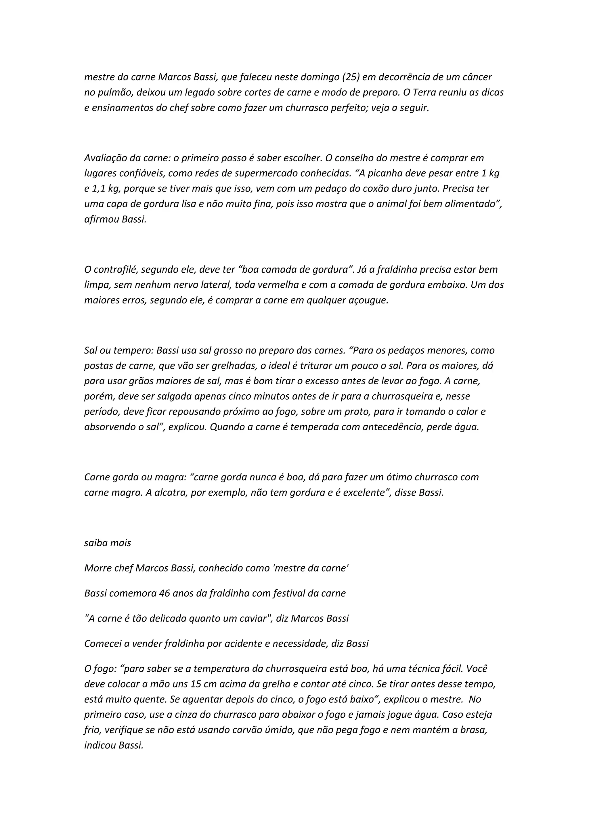 O documento fornece dicas do mestre da carne Marcos Bassi sobre como fazer um churrasco perfeito, incluindo escolher a carne certa, temperar e assar corretamente, e servir a quantidade adequada por pessoa. Ele explica os melhores cortes de carne para churrasco, como temperar e posicionar na grelha, e quais acompanhamentos servir.