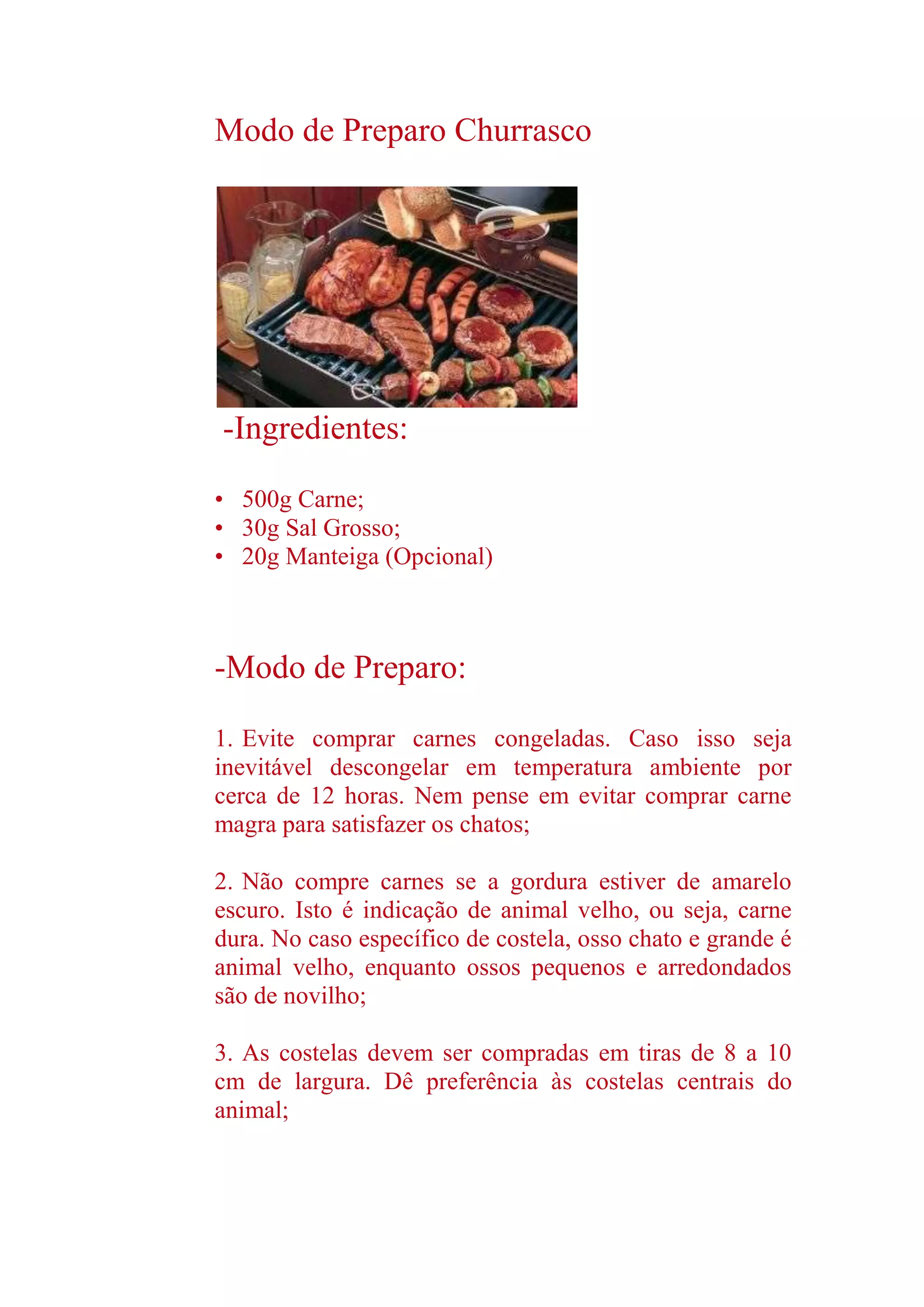 Este documento fornece instruções sobre como preparar um churrasco, incluindo comprar carnes magras e evitar aquelas congeladas ou com gordura amarelada, assar as costelas com o osso para baixo sobre brasa indireta e virar a carne com frequência, e salgar a carne apenas depois de pegarem cor para não ficarem duras.