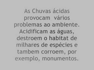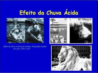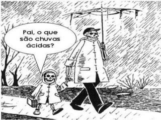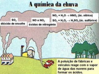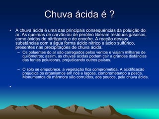 A chuva ácida resulta da poluição do ar, sendo causada pela queima de combustíveis fósseis que libera óxidos tóxicos que, ao reagirem com a água, formam ácidos prejudiciais. Essa acidificação afeta negativamente o solo, vegetação, organismos aquáticos, estruturas construídas e pode comprometer a saúde humana. Medidas para prevenir a chuva ácida incluem conservação de energia, uso de transporte coletivo e fontes de energia menos poluentes.