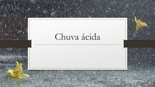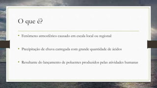 A chuva ácida é causada pela emissão de poluentes como enxofre e óxidos de nitrogênio que se combinam com a água da atmosfera para formar ácidos como o sulfúrico e o nítrico. Isso prejudica a saúde humana, danifica construções e tem impactos negativos no meio ambiente como a acidificação de lagos e a desflorestação.