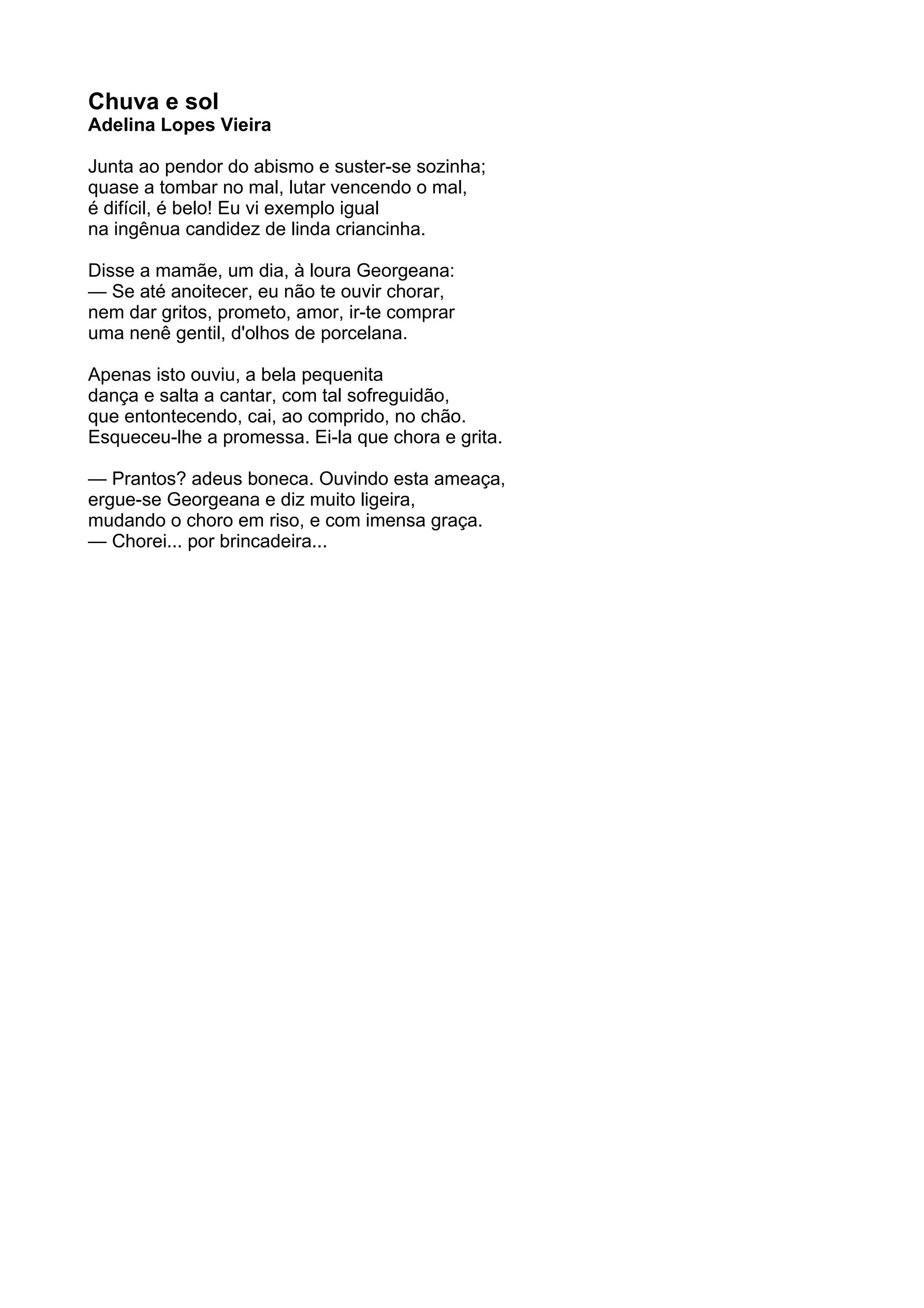O poema descreve uma cena onde uma mãe promete uma boneca de porcelana à sua filha se ela não chorar até anoitecer. A menina cai ao dançar animadamente para não chorar, mas se levanta rapidamente e diz que estava apenas brincando ao chorar, para não perder a boneca prometida.