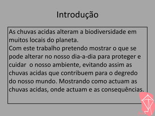 As chuvas ácidas alteram a biodiversidade e causam danos ao meio ambiente. Elas ocorrem quando compostos de enxofre e nitrogênio se misturam com a água da chuva, formando ácidos que afetam florestas, lagos e monumentos históricos. Embora medidas como uso de transporte público e fontes de energia limpa possam reduzir o problema, as regiões mais afetadas incluem a Europa e partes dos EUA e Canadá.