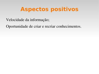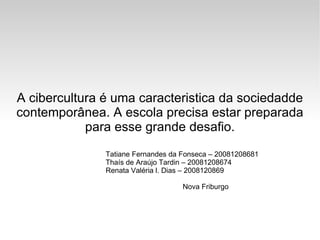 O documento discute o que é cibercultura, sua relação com a educação e seus aspectos positivos e negativos. A cibercultura envolve a interação entre pessoas em espaços virtuais e o uso da tecnologia no cotidiano. Na educação, os professores passam a guiar a inteligência coletiva dos alunos. Entre os pontos positivos estão a velocidade da informação e a criação de conhecimento, mas há também aspectos negativos como a insegurança com novas tecnologias e a exclusão digital. A escola precisa