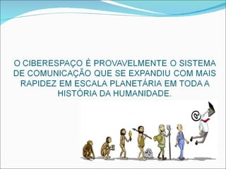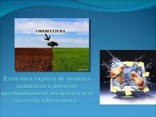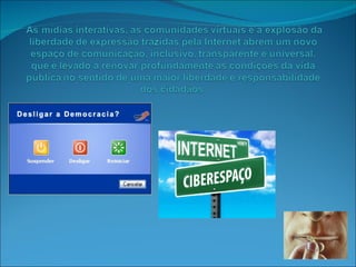 O documento discute como as novas tecnologias da comunicação, como a internet, estão alterando os processos sociais, culturais e políticos através da ciberdemocracia. Isso inclui a liberação da emissão de vozes, a conectividade generalizada e a reconfiguração social, cultural, econômica e política.