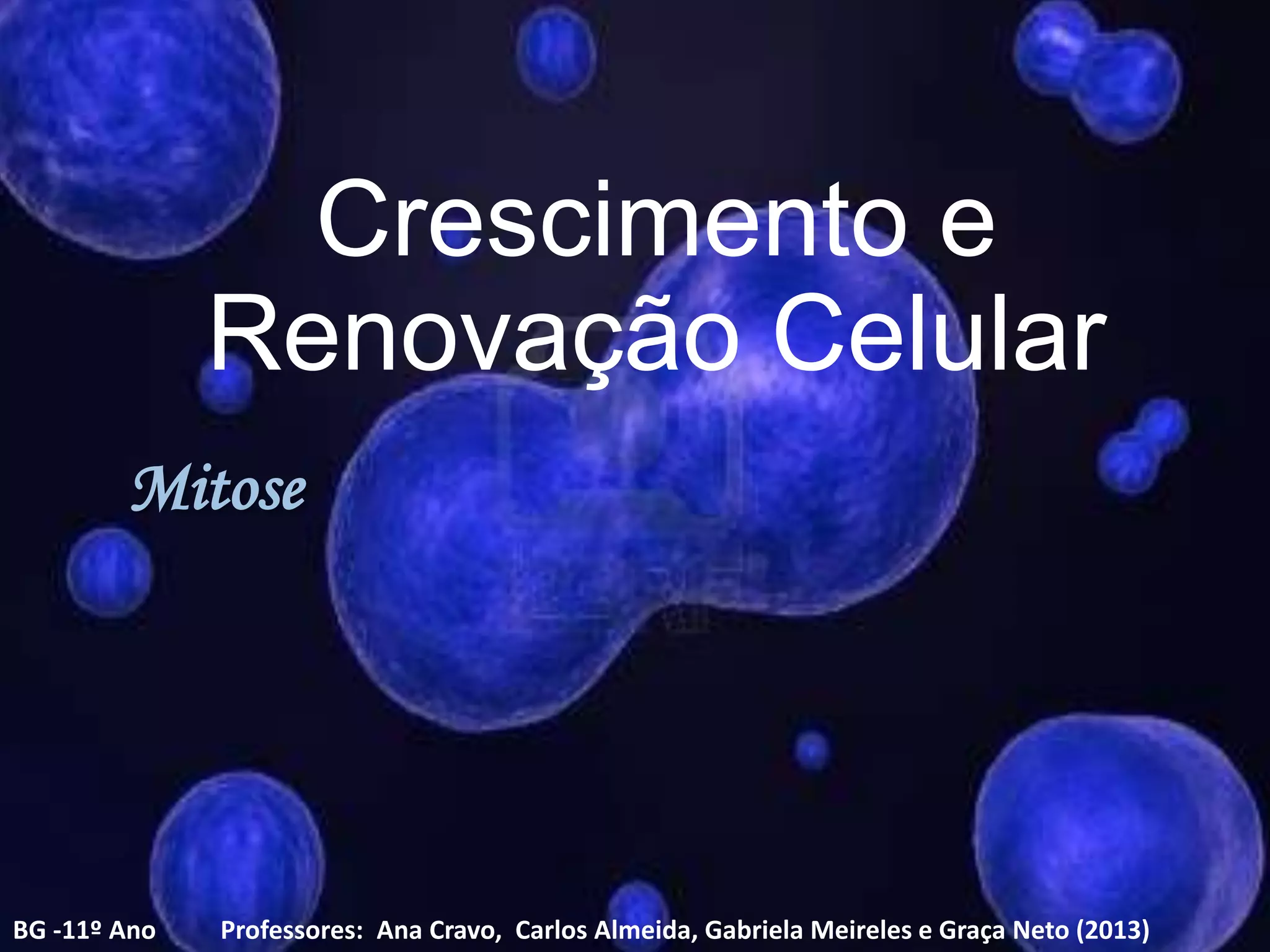 Este documento descreve os processos de crescimento e renovação celular através da mitose. Apresenta os conceitos-chave do ciclo celular, incluindo a interfase, divisão celular e as fases da mitose. Explica também a variação da quantidade de DNA ao longo do ciclo celular e mecanismos de regulação do mesmo.