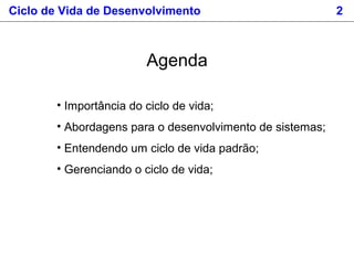 O documento discute os principais aspectos relacionados ao ciclo de vida de desenvolvimento de sistemas, incluindo abordagens como sequencial, espiral, prototipagem e ágil. Ele explica as fases típicas de um ciclo de vida padrão como pré-desenvolvimento, desenvolvimento e pós-desenvolvimento e como o gerenciamento adequado do ciclo de vida é importante para o sucesso de um projeto.