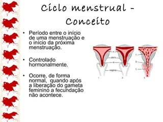 O documento discute o ciclo menstrual feminino, incluindo suas fases, duração normal, hormônios envolvidos e seus efeitos no corpo. Aborda também possíveis distúrbios do ciclo menstrual relacionados à atividade física intensa e sintomas pré-menstruais como a Tensão Pré-Menstrual.