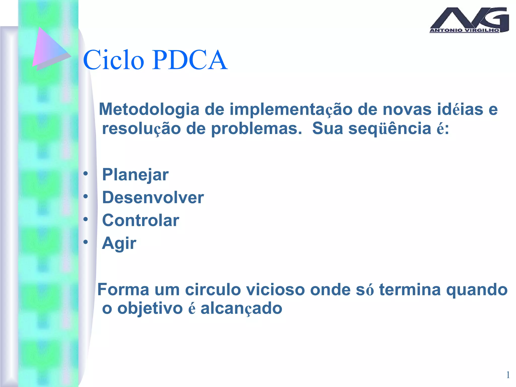 O documento descreve o ciclo PDCA, que é uma metodologia para implementação de novas ideias e resolução de problemas através das etapas de Planejar, Desenvolver, Controlar e Agir, formando um ciclo contínuo até alcançar o objetivo. É detalhado o que deve ser feito em cada etapa do ciclo.