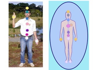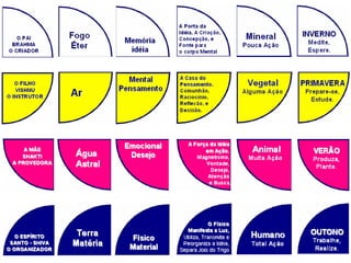 O documento discute os conceitos espirituais de diferentes entidades divinas como Brahman, Brahma, Vishnu, Shiva e Shakti e como elas se relacionam com os diferentes estágios da evolução humana. É dividido em seções que falam sobre os ciclos cósmicos, chakras, elementos, corpos sutis, escolas espirituais e mantras.