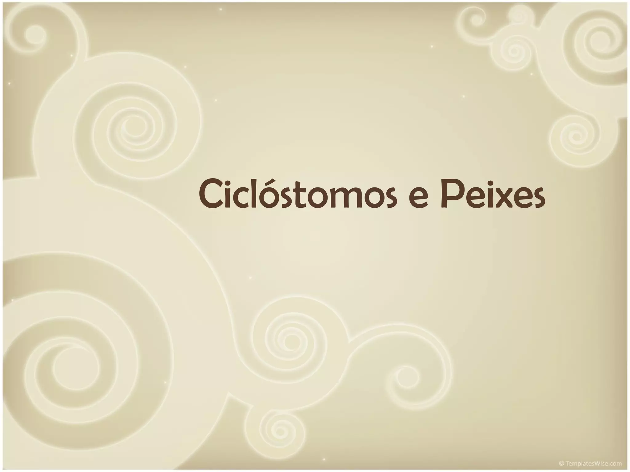 Ciclóstomos e peixes são vertebrados aquáticos. Ciclóstomos como lampreias têm corpo cilíndrico e boca em forma de ventosa com dentes. Existem cerca de 50 espécies que vivem em águas doces e salgadas. Peixes são divididos em cartilaginosos como tubarões e ósseos como salmões. Cartilaginosos têm esqueleto cartilaginoso e reprodução interna. Ósseos têm esqueleto ósseo e mais de 30.000 espécies, incl