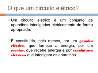O documento descreve os elementos essenciais de um circuito elétrico simples, incluindo um gerador que fornece energia, um receptor que recebe a energia, e condutores que interligam os aparelhos. Ele lista e explica brevemente os principais componentes de um circuito, como baterias, lâmpadas, resistores, dispositivos de manobra e segurança.