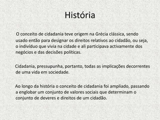 O documento discute o conceito de cidadania, desde suas origens na Grécia antiga até os dias atuais. Apresenta os diferentes tipos de cidadania, como social, universal e política, e define cidadania como o conjunto de direitos e deveres de um indivíduo em uma sociedade democrática.