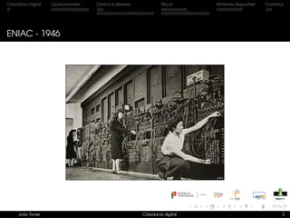 O documento discute os conceitos de cidadania digital, incluindo oportunidades, direitos, responsabilidades e riscos associados ao uso da tecnologia. Aborda tópicos como privacidade online, cyberbullying, compartilhamento excessivo de informações pessoais e desinformação.