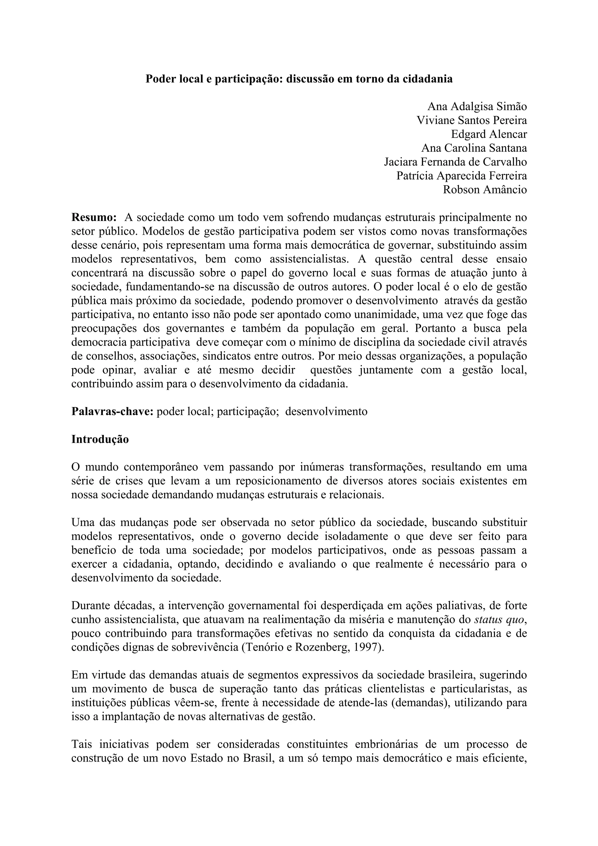 O documento discute o papel do governo local e formas de atuação junto à sociedade para promover o desenvolvimento através da participação cidadã. Argumenta que modelos de gestão participativos podem substituir modelos representativos e assistencialistas, permitindo que as pessoas decidam o que é necessário para o desenvolvimento da sociedade. No entanto, a participação da população depende do mínimo de organização da sociedade civil através de conselhos e associações.