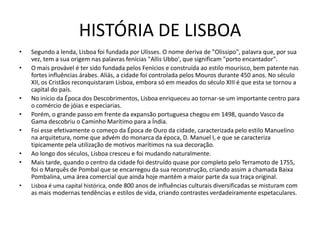 Lisboa foi provavelmente fundada pelos Fenícios e controlada pelos Mouros por 450 anos. No século XIII tornou-se a capital de Portugal e enriqueceu como centro comercial durante a Era dos Descobrimentos, especialmente após Vasco da Gama descobrir o caminho marítimo para a Índia em 1498. O terramoto de 1755 destruiu quase completamente o centro da cidade, que foi reconstruído segundo os planos do Marquês de Pombal, criando a Baixa Pombalina.