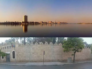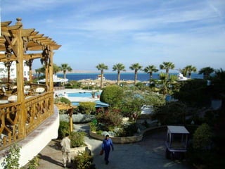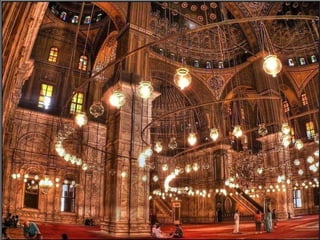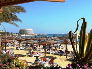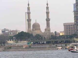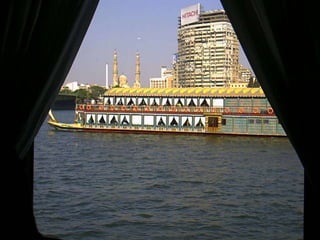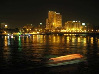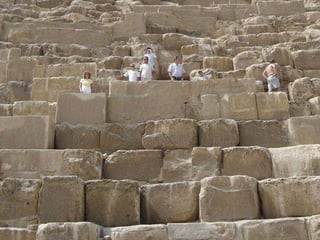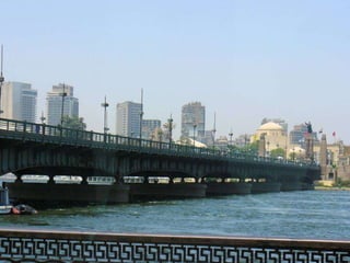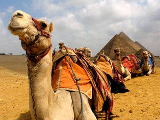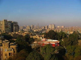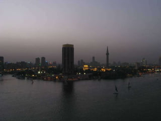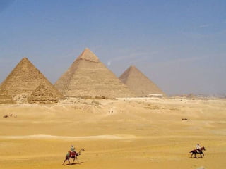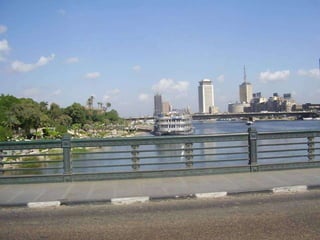 O documento descreve vários pontos turísticos no Cairo, como o Museu de Antiguidades Egípcias, a Mesquita de al-Hâkim, o Nilo e as Pirâmides de Gizé, incluindo a Grande Pirâmide de Keops. O texto também menciona outros locais arqueológicos próximos ao Cairo, como Saqqara e as pirâmides em degraus de Djoser.