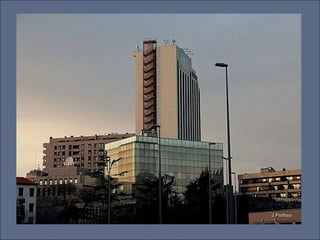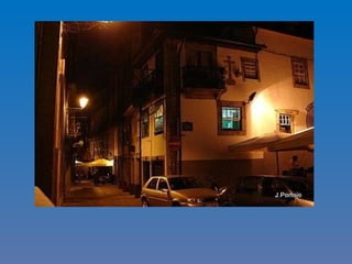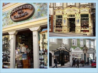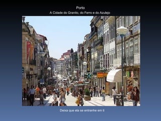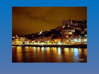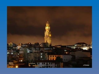 O documento fornece um roteiro turístico da cidade do Porto, destacando seus principais pontos de interesse culturais e arquitetônicos, como museus, teatros, igrejas e fontes históricas, assim como suas tradições culinárias como o bacalhau e doces típicos. O texto também descreve aspectos da cultura e artes locais, com ênfase na escultura, e sugere atrações noturnas como o fado.