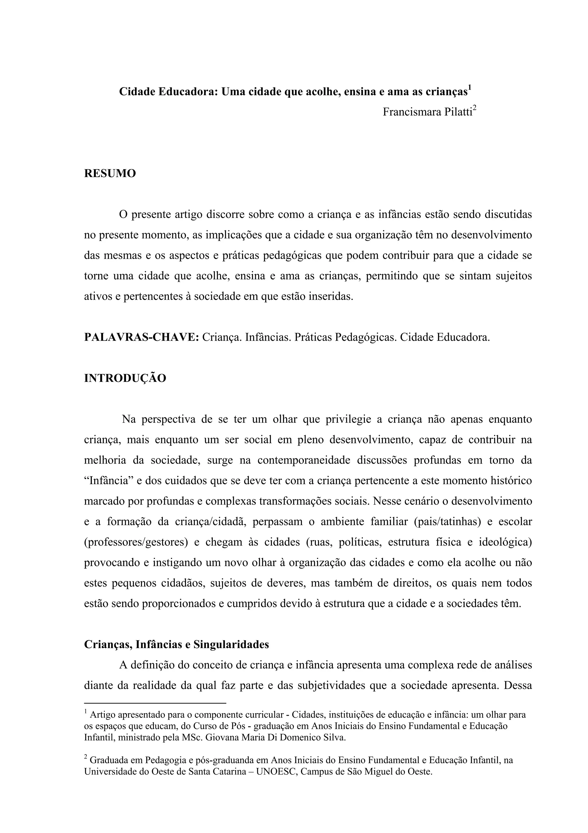 Este documento discute como as cidades podem se tornar mais acolhedoras, educadoras e amorosas para as crianças. Argumenta-se que as cidades atualmente não são projetadas para as necessidades e desenvolvimento das crianças. O documento propõe práticas pedagógicas que podem ajudar a transformar as cidades em ambientes que ensinam e apoiam as crianças.
