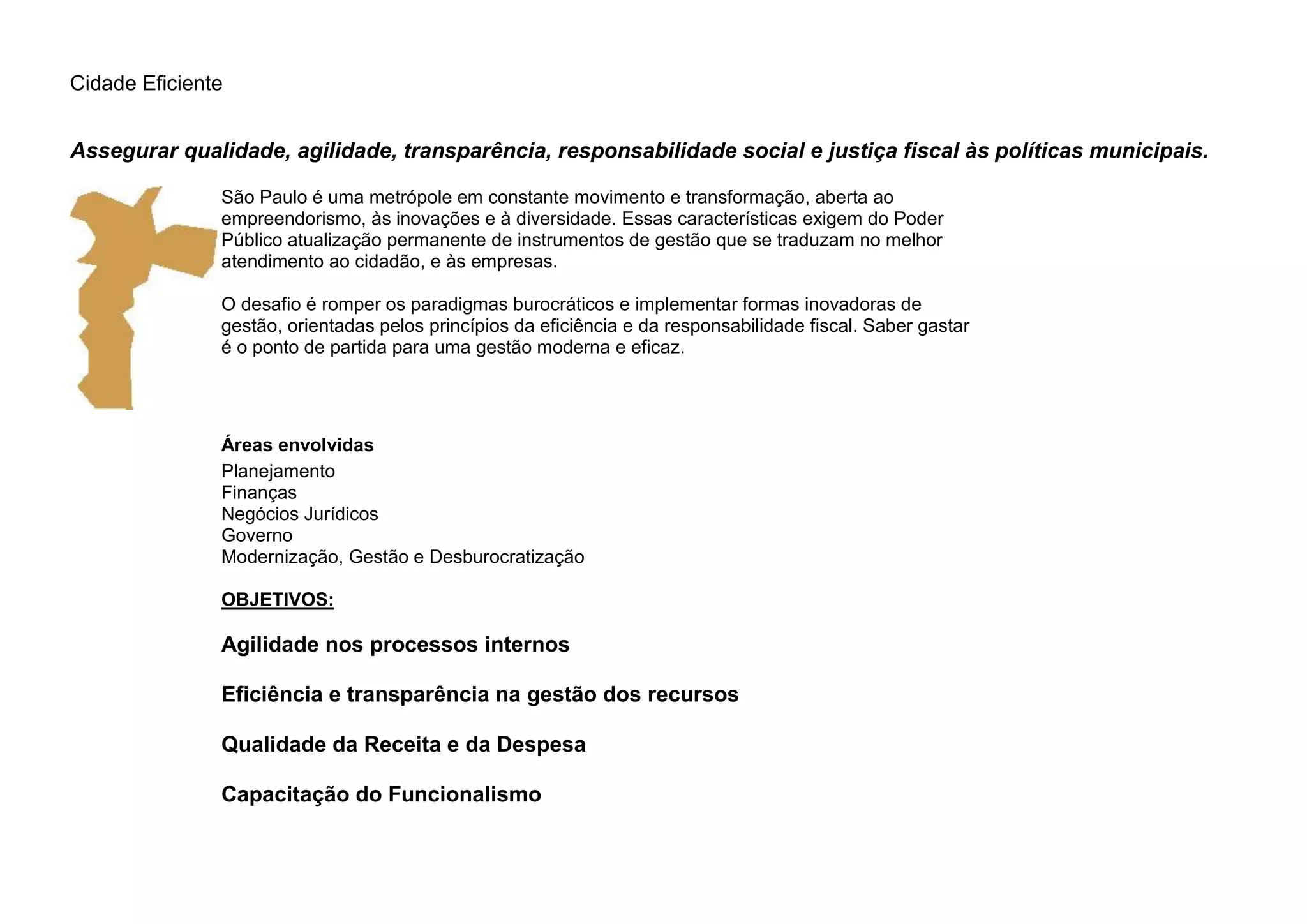 O documento propõe uma gestão municipal eficiente e moderna através da agilidade nos processos internos, eficiência e transparência na gestão dos recursos e qualidade da receita e despesa. Ele define objetivos e metas como implantar sistemas eletrônicos para execuções fiscais, monitoramento, licenciamento e capacitar servidores.