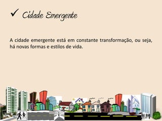 O documento descreve a cidade emergente e seus principais problemas. A cidade emergente é caracterizada como dispersa, fragmentada e heterogênea, com crescimento impulsionado pelo aumento da população e mobilidade. Suas intervenções são espaços não planejados, gerando problemas ambientais, sociais e econômicos. Problemas físico-estruturais incluem limites indefinidos e desarticulação entre partes da cidade.