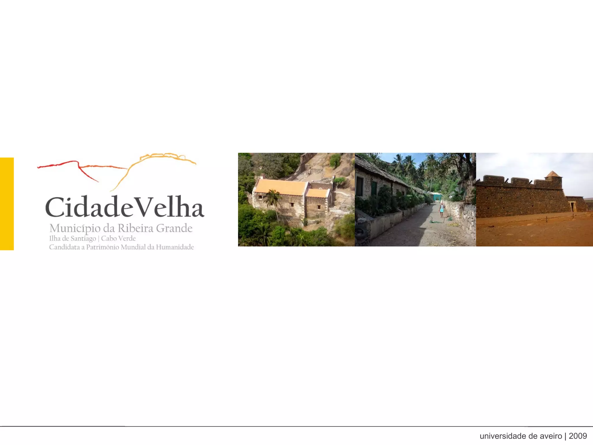 O documento propõe a criação de ferramentas digitais para preservar e explorar a história da Cidade Velha, incluindo um sistema de gestão de informação, uma wiki, uma visita virtual e jogos educativos sobre a cidade.