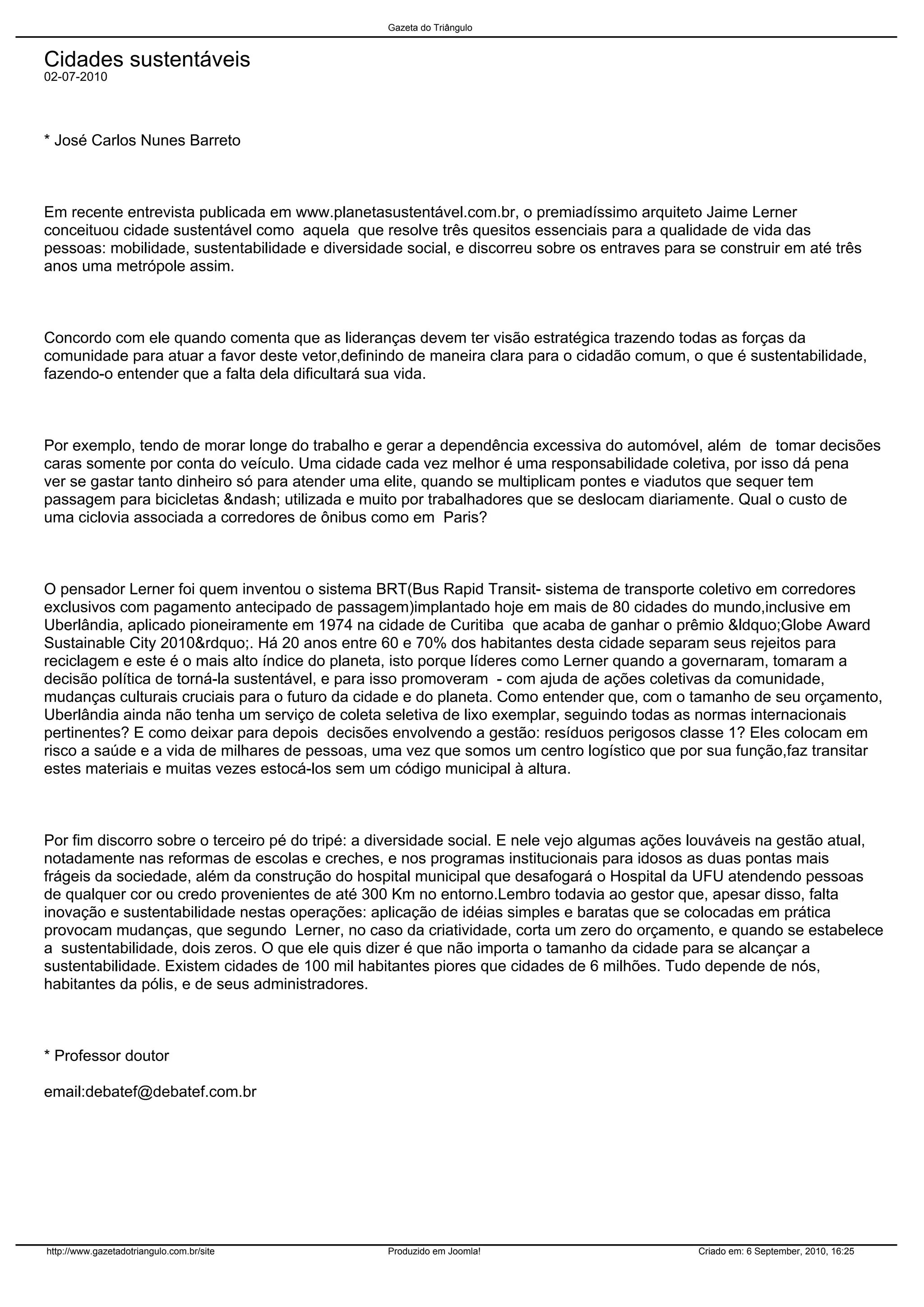 O artigo discute as ideias do arquiteto Jaime Lerner sobre cidades sustentáveis, que ele define como aquelas que resolvem mobilidade, sustentabilidade e diversidade social. O autor concorda com Lerner que lideranças devem ter visão estratégica e envolver a comunidade para tornar a sustentabilidade clara e necessária para os cidadãos. Ele também elogia programas em Uberlândia mas aponta falta de inovação e coleta seletiva de lixo exemplar.