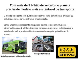 O documento discute a necessidade de modelos de transporte mais sustentáveis devido ao grande número de veículos no mundo e como as cidades precisam se tornar mais sustentáveis. Ele também menciona o programa ICES que ajuda cidades a se tornarem mais sustentáveis e como Florianópolis está focando em mobilidade urbana e saneamento entre outras áreas.