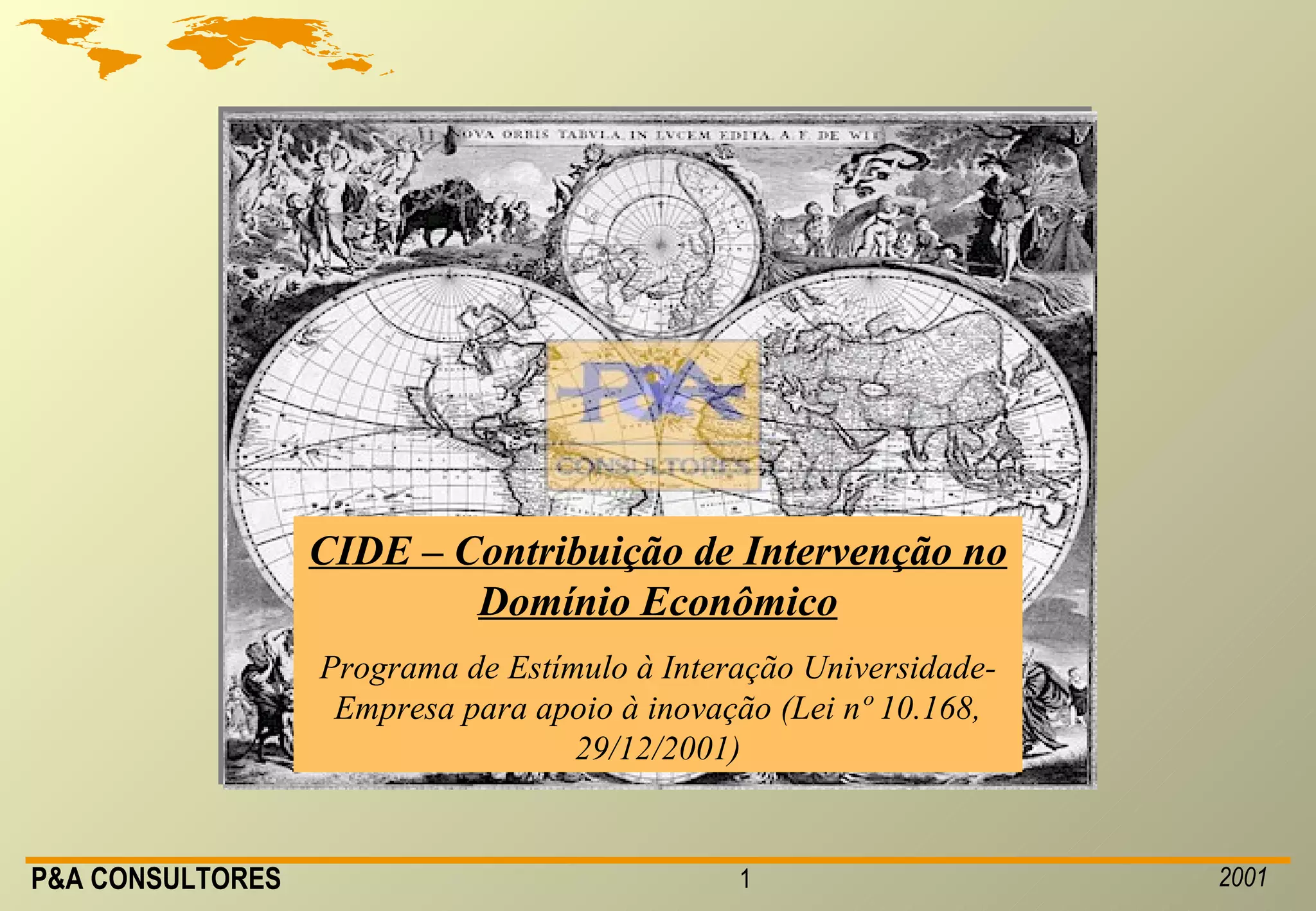 A CIDE financia o Programa de Estímulo à Interação Universidade-Empresa para apoiar a inovação. Incide sobre pagamentos mensais a não residentes por royalties. Compete à União cobrá-la com alíquota de 10% sobre os valores pagos. Sua natureza e limites dependem de se entender como contribuição ou imposto.