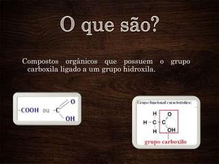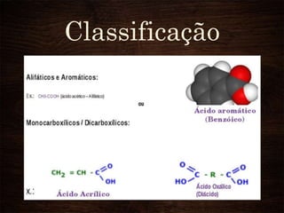 Os ácidos carboxílicos são compostos orgânicos que possuem grupos carboxila e hidroxila. Eles têm várias propriedades físicas e químicas e são usados na produção de ésteres, sais orgânicos, anidridos, proteínas, ácidos nucleicos e outros compostos, bem como em aplicações como desinfetantes, bebidas, polímeros, tintas e corantes.