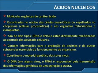 O documento descreve as principais características dos ácidos nucleicos DNA e RNA. O DNA é encontrado no núcleo das células eucarióticas e contém as informações genéticas, enquanto o RNA participa da síntese de proteínas. O DNA possui duas fitas complementares em forma de dupla hélice, enquanto o RNA é de fita única.