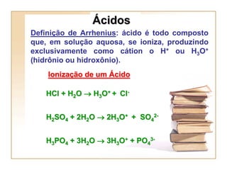 1) O documento define ácidos como compostos que, em solução aquosa, se ionizam produzindo H+ ou H3O+.