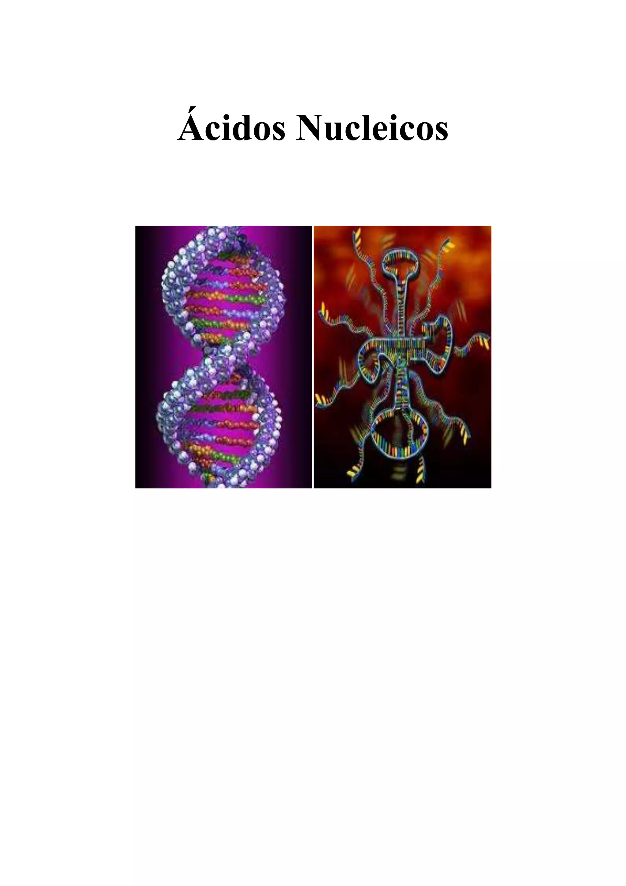 O documento descreve a estrutura e função dos ácidos nucleicos DNA e RNA. O DNA é constituído por duas cadeias enroladas em hélice dupla e armazena a informação genética, sendo replicado semiconservativamente. O RNA existe em diferentes formas e tipos e participa na transcrição e tradução da informação genética em proteínas.