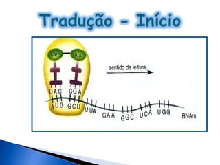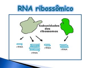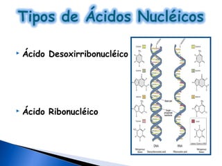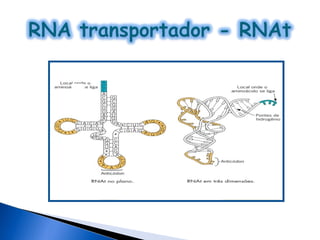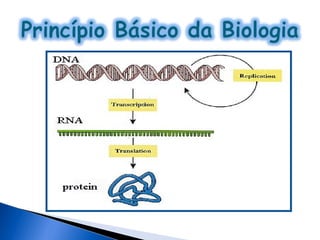 O documento discute os principais conceitos sobre DNA e RNA, incluindo sua estrutura, função e papel na síntese de proteínas. Aborda tópicos como nucleotídeos, bases nitrogenadas, replicação, transcrição, tradução e o código genético.