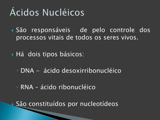 Os ácidos nucléicos DNA e RNA são responsáveis pelo controle dos processos vitais de todos os seres vivos. Eles são constituídos por nucleotídeos compostos por açúcar, base nitrogenada e grupo fosfato. O DNA armazena e transmite informações genéticas através de sua replicação e o RNA auxilia na síntese de proteínas.