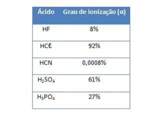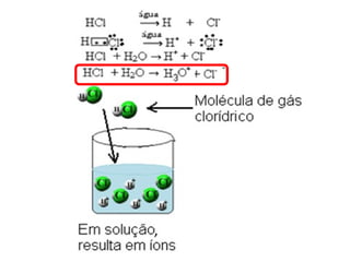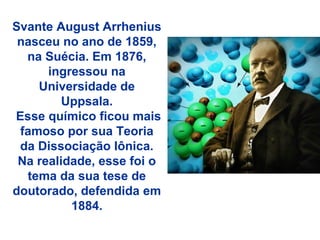 O documento descreve a teoria da dissociação iônica proposta por Svante Arrhenius no século 19. Arrhenius realizou experimentos elétricos com diferentes soluções e compostos para testar sua teoria. Ele observou que soluções de compostos iônicos como sal de cozinha conduziam eletricidade, ao contrário de soluções de compostos moleculares como açúcar. Isso levou Arrhenius a concluir que compostos iônicos se dissociam em íons livres na solução, permitindo