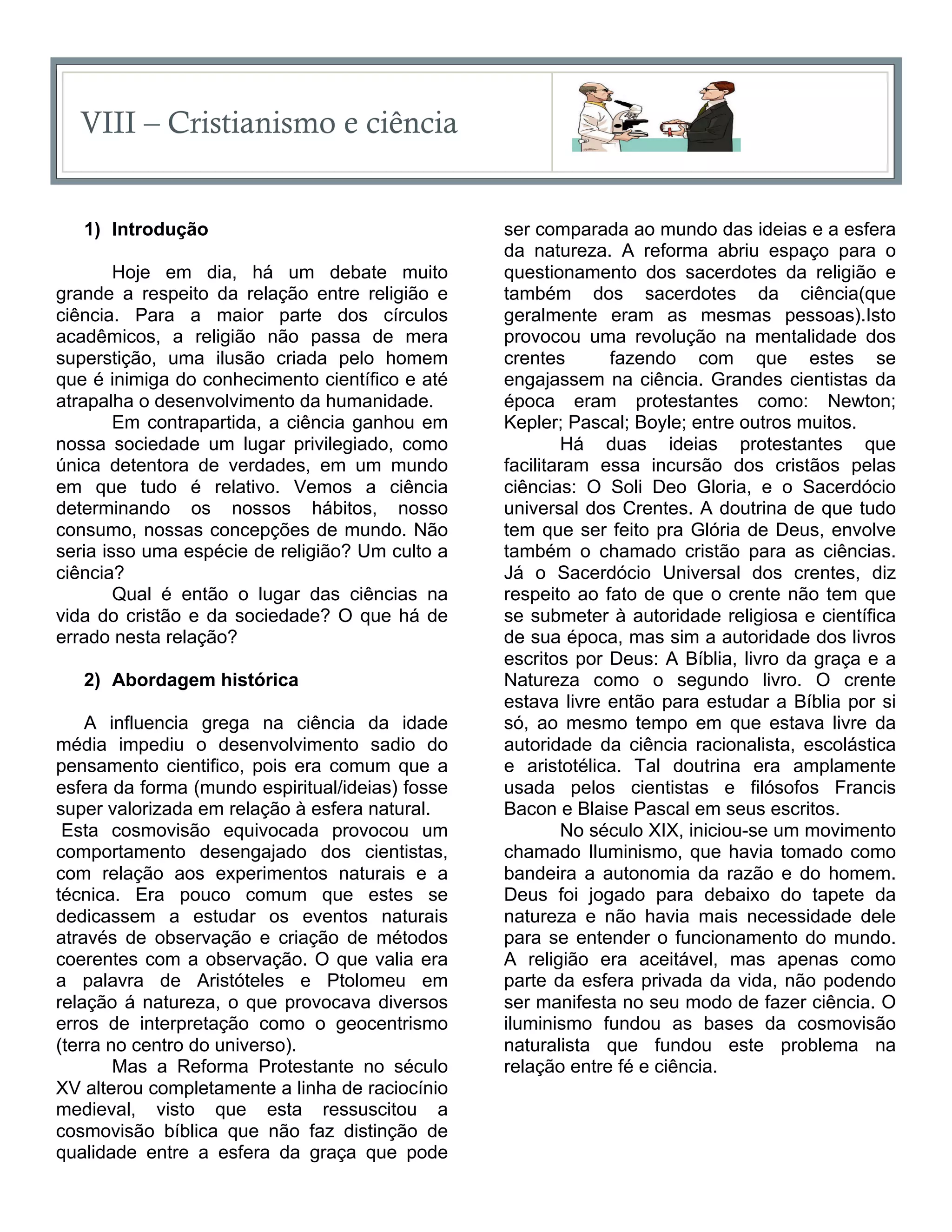 O documento discute a relação entre cristianismo e ciência ao longo da história. A influência grega impediu o desenvolvimento da ciência medieval, mas a Reforma Protestante permitiu o questionamento da autoridade religiosa e científica. O naturalismo rejeita Deus e causa problemas na relação entre fé e ciência, porém o cristianismo apoiou o desenvolvimento da ciência moderna e os cientistas cristãos podem fazer ciência a partir de uma perspectiva bíblica.