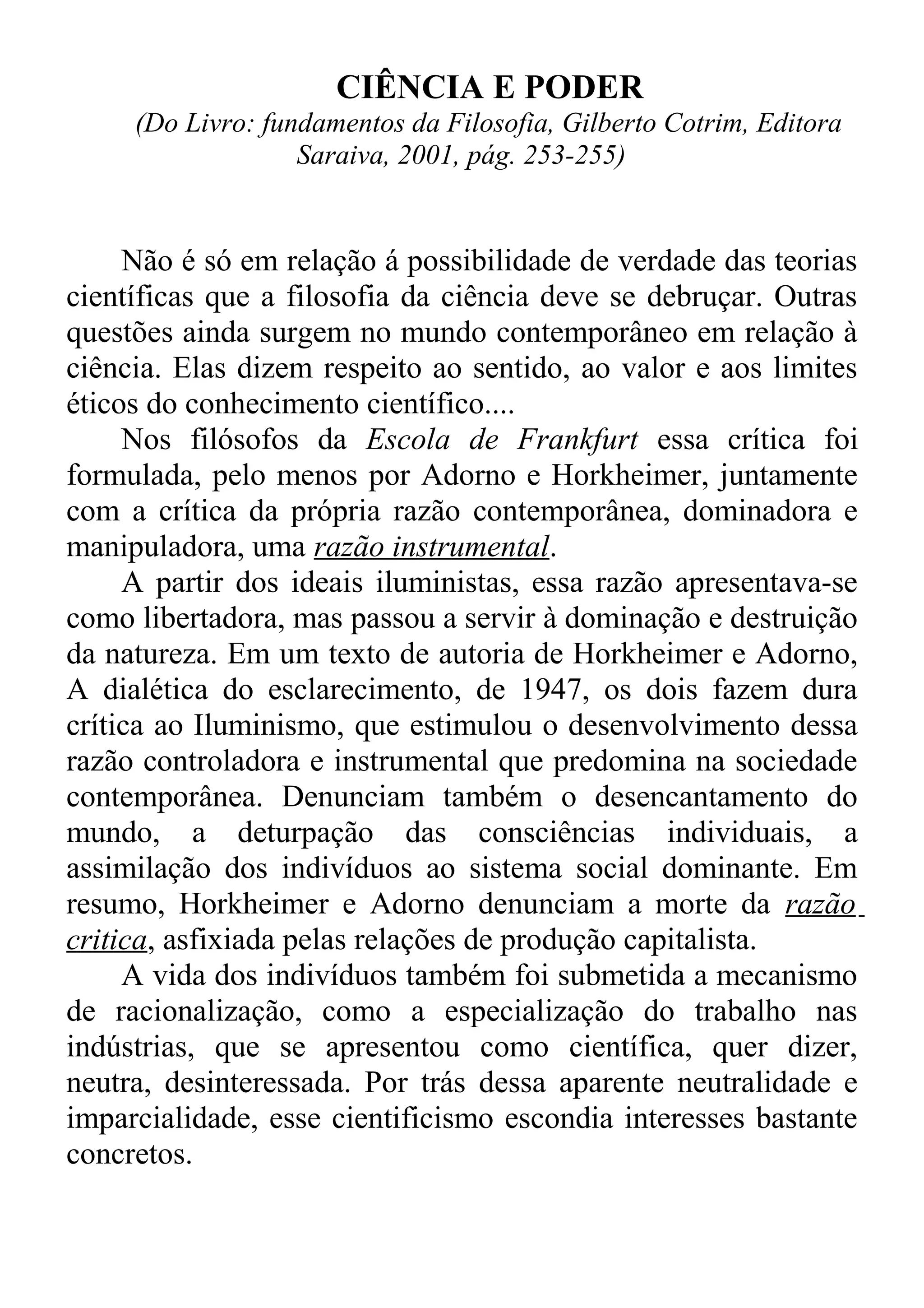 A ciência e a tecnologia podem ser usadas para fins de dominação e controle social quando desenvolvidas com base em interesses econômicos e políticos, em detrimento do progresso humano. Filósofos como Horkheimer, Adorno e Foucault criticaram como a razão instrumental é usada para manipular as pessoas. Uma reorientação dos rumos do desenvolvimento tecnológico exigiria mudanças na estrutura social.