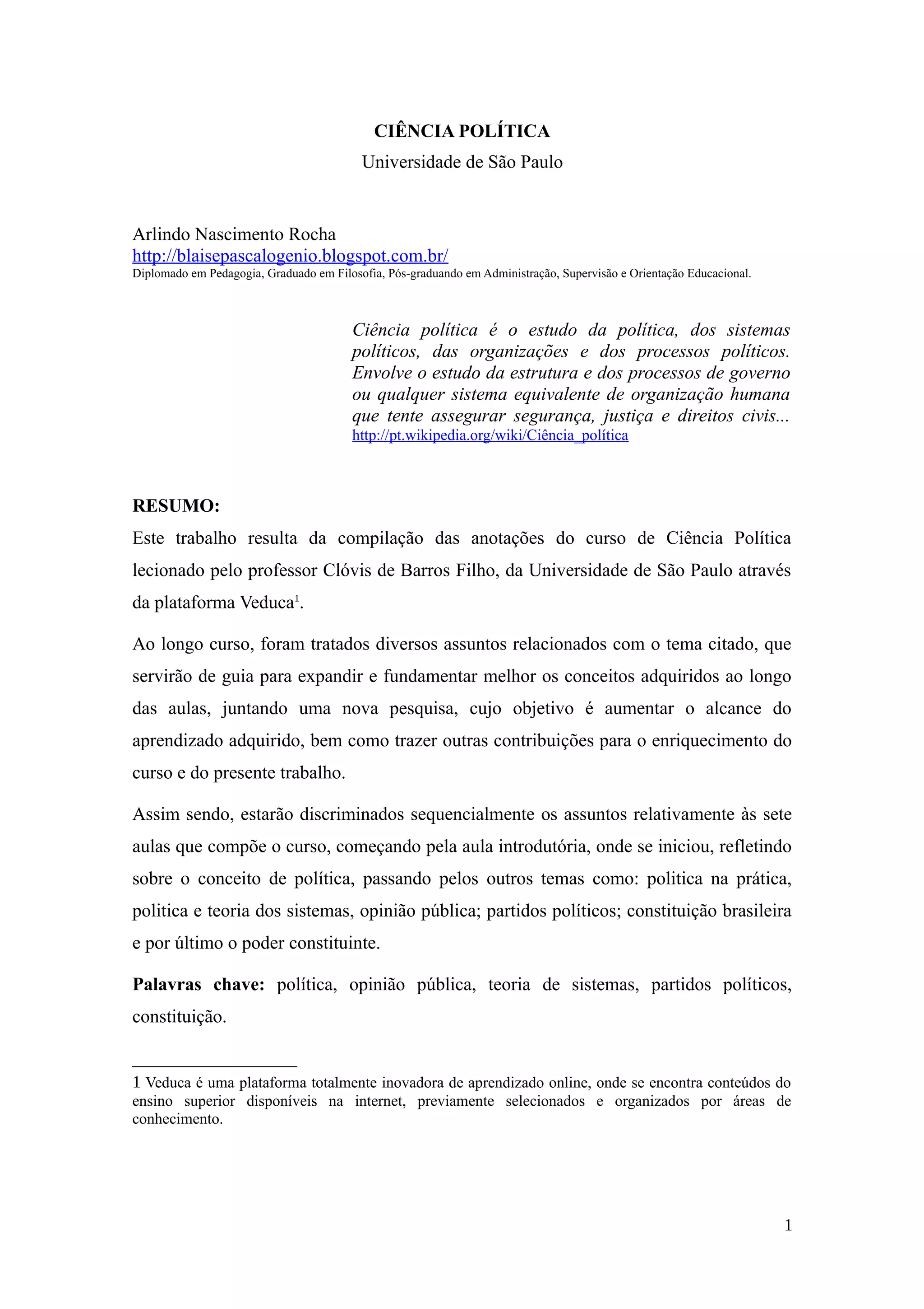 O documento aborda o curso de Ciência Política da Universidade de São Paulo, lecionado pelo professor Clóvis de Barros Filho, destacando conceitos fundamentais como política, opinião pública, partidos políticos e a constituição brasileira. A reflexão parte do conceito de política no senso comum, expandindo para a noção de participação ativa dos cidadãos na política e na gestão de desejos conflituosos. São também mencionadas referências filosóficas sobre a organização da sociedade, como os pensamentos de Platão e Aristóteles sobre o ideal de cidade e a harmonia cósmica.