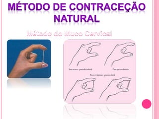 O documento descreve três métodos contraceptivos: o método do muco cervical, a pílula do dia seguinte e o preservativo. O método do muco cervical envolve a observação do muco cervical para identificar os períodos férteis. A pílula do dia seguinte é um método de emergência para evitar gravidez após relação sexual desprotegida. O preservativo é uma barreira contra a passagem de esperma durante a relação sexual.