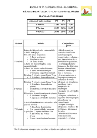 1) O documento apresenta o plano anual de aulas para a disciplina de Ciências da Natureza do 5o ano em uma escola portuguesa, dividido em três períodos letivos.