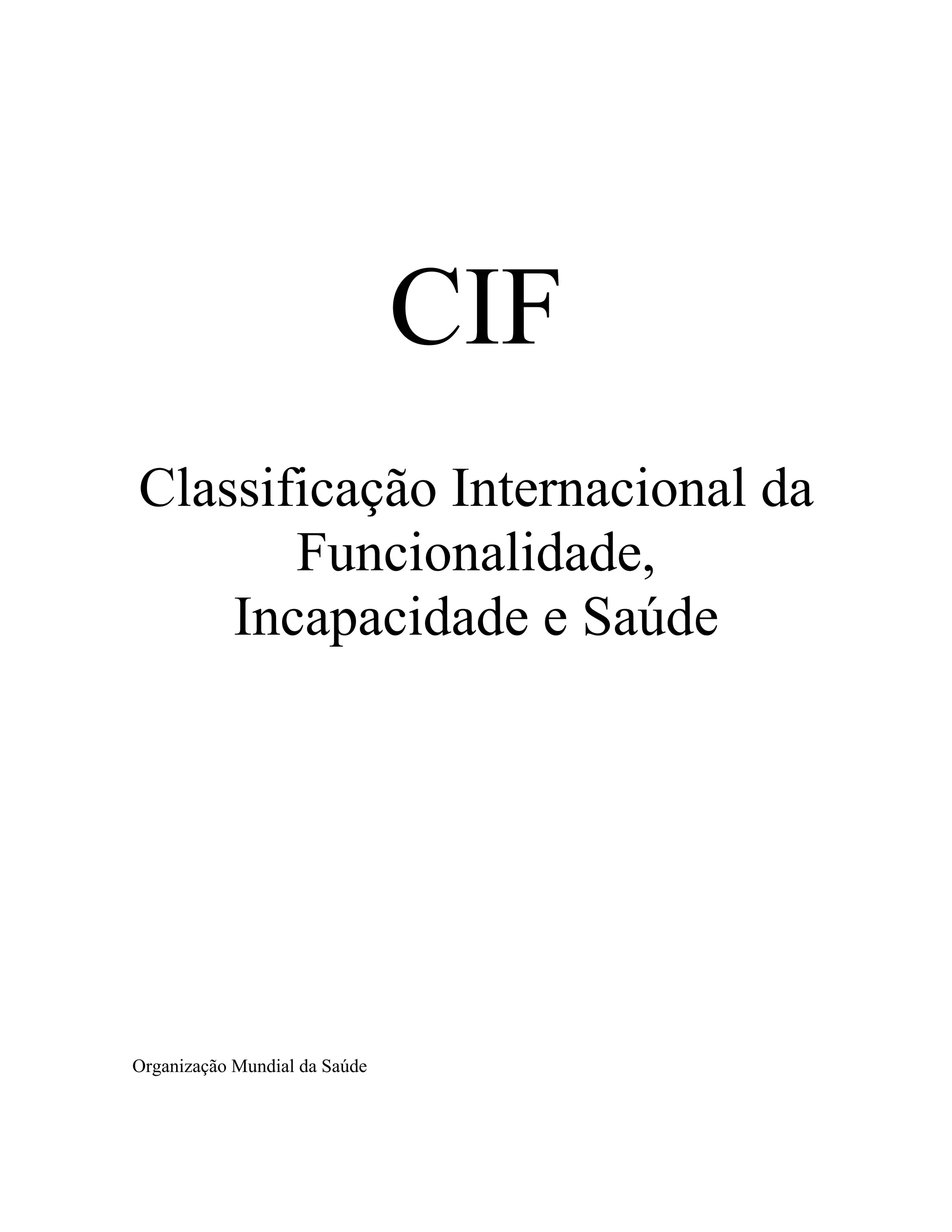 Este documento apresenta a Classificação Internacional da Funcionalidade, Incapacidade e Saúde (CIF). A CIF fornece uma estrutura para descrever a saúde e os estados relacionados com a saúde de uma pessoa. A CIF descreve a funcionalidade humana em termos de funções do corpo, atividades e participação, e relaciona estes componentes com fatores ambientais. A CIF tem como objetivos fornecer uma linguagem comum para a saúde, permitir a comparação internacional de dados e servir como ferramenta para pesquisa