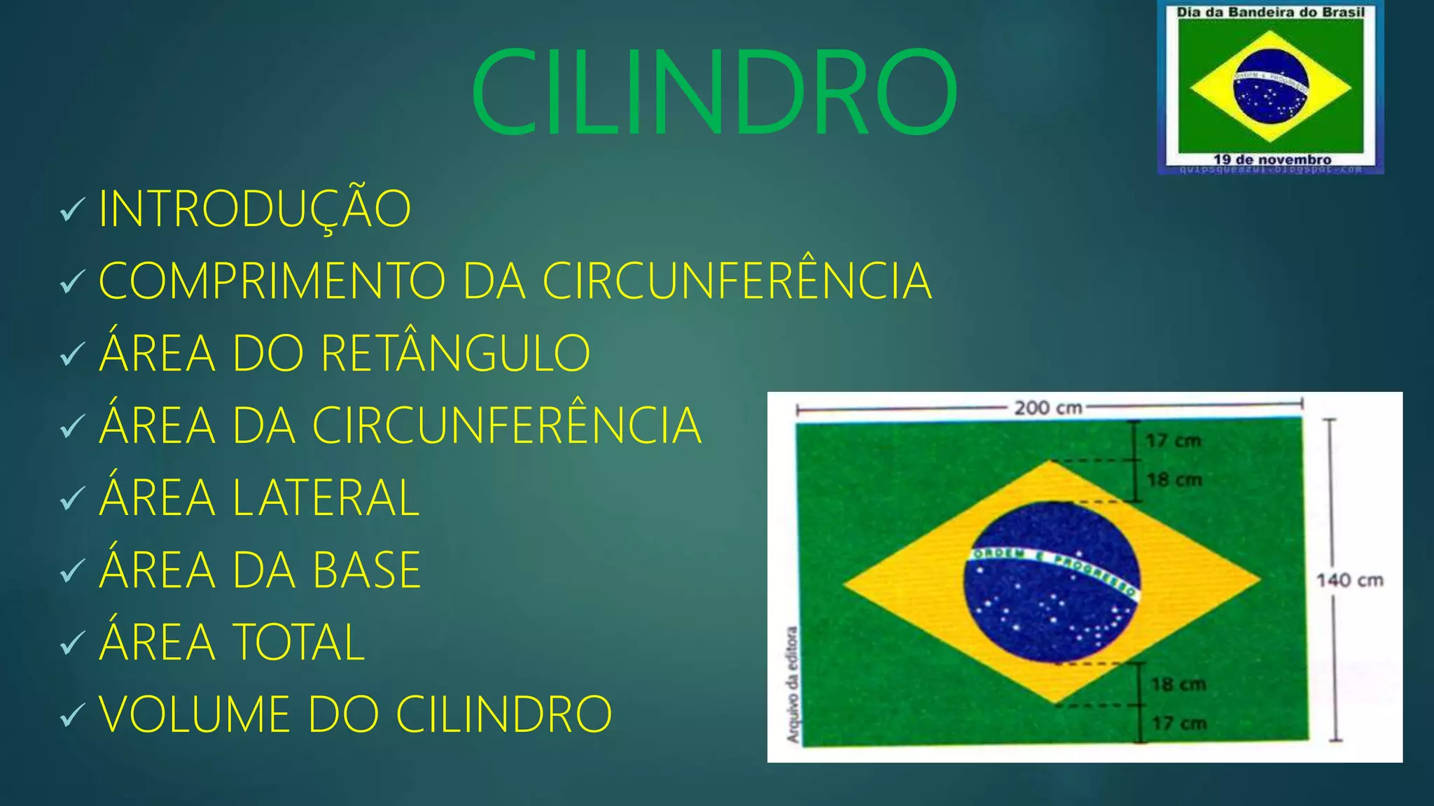 O documento discute os conceitos de cilindro, incluindo o cálculo de áreas e volumes. Explica como calcular a área da circunferência, área do retângulo, área lateral e área total de um cilindro. Também mostra como calcular o volume de um cilindro e de um prisma retangular. Apresenta exemplos de cálculos de áreas e volumes em diferentes situações.