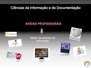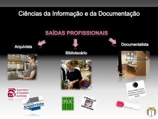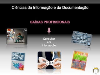 O documento apresenta o curso de Ciências da Informação e da Documentação da Universidade Fernando Pessoa, incluindo informações sobre a duração do curso, requisitos de entrada, áreas de estudo, estágios e saídas profissionais.