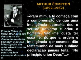 O documento apresenta declarações de vários ganhadores do Prêmio Nobel sobre a compatibilidade entre ciência e fé. Muitos afirmam que quanto mais descobertas científicas são feitas, mais evidente se torna a existência de um Criador inteligente por trás do Universo. O documento conclui convidando o leitor a conhecer Jesus Cristo.