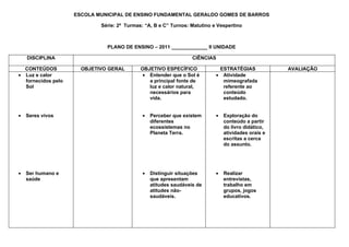 O documento apresenta o plano de ensino de Ciências para alunos do 2o ano do Ensino Fundamental, dividido em 4 unidades. Cada unidade contém os conteúdos, objetivos, estratégias de ensino e formas de avaliação relacionados aos temas de Ar, Água, Solo e outros.