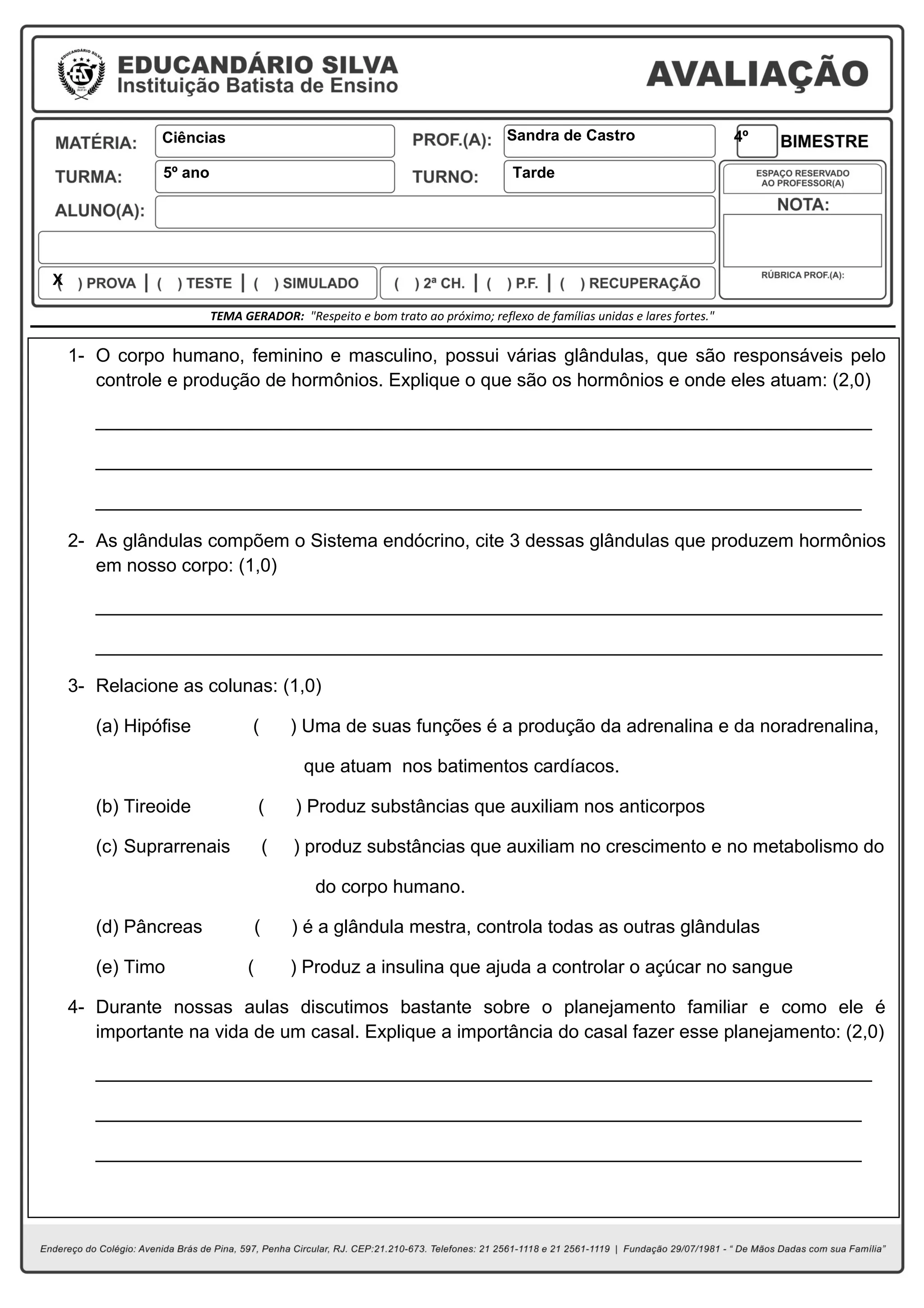 (e) Timo ( ) Produz a insulina que ajuda a controlar o açúcar no sangue